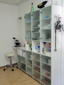 Der Klinik-Raum verfügt über einen elektrischen Gynostuhl und eine reichhaltige Ausstattung.